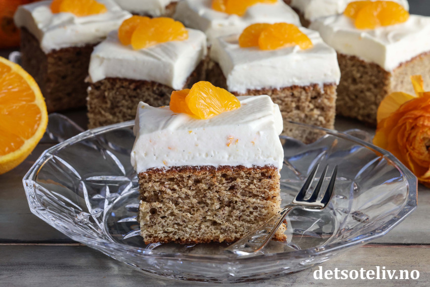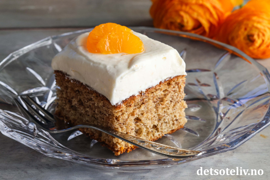 Søt banankake går veldig bra sammen med fløyelsmyk mascarponekrem som smaksettes med vanilje og appelsin.