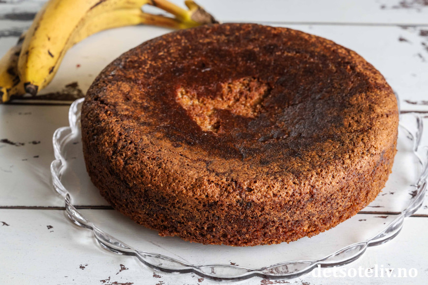 ♥ Det går fint å steke banankaken dagen før servering. Pakk den da godt inn i plast slik at den holder seg saftig. Kaken bør serveres samme dag som den fylles med banankrem og dekkes med sjokoladeglasur.