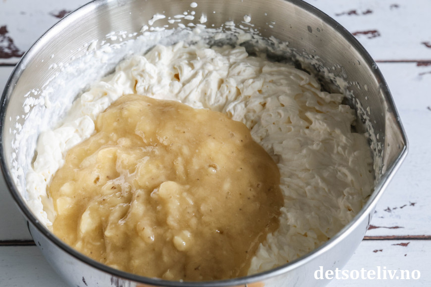 Mos bananene (jeg bruker stavmikser til dette). Vend bananmosen inn i kremen.