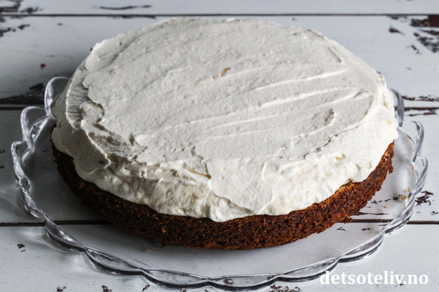 Når glasuren er tykk og smørbar, bres den over toppen av kaken i et tykt lag.