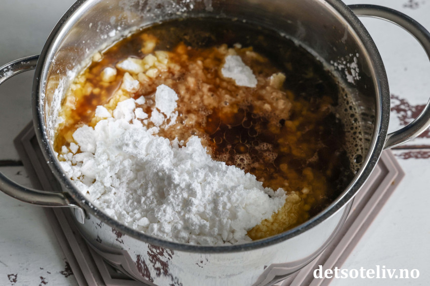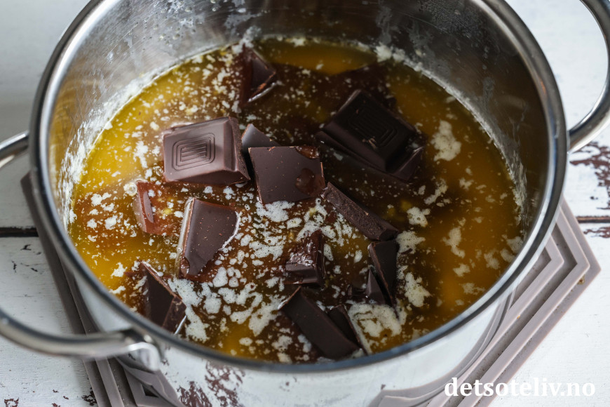 Smelt smøret i en kjele. Tilsett oppdelt kokesjokolade.