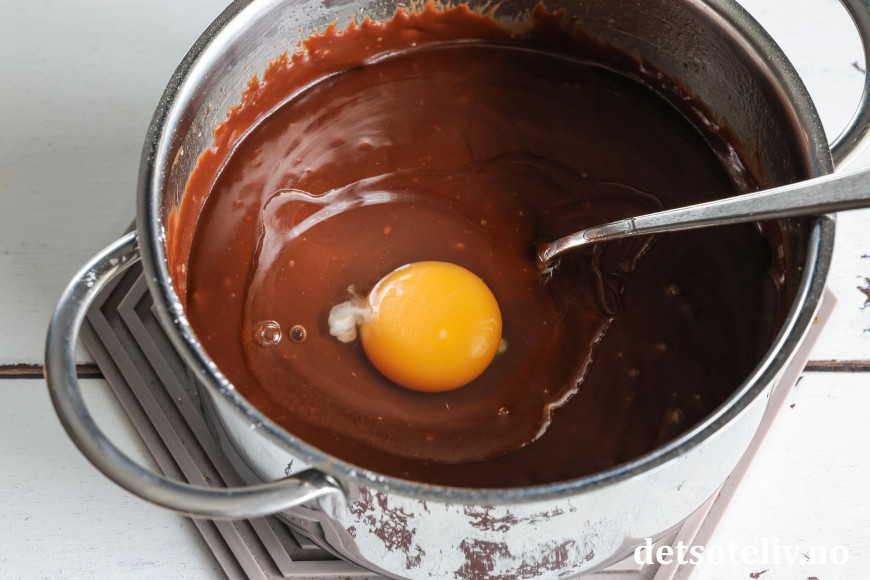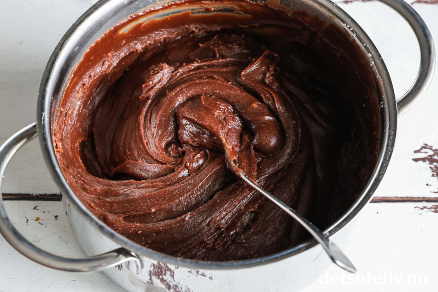 La sjokoladen smelte i det varme smøret og rør blandingen jevn.