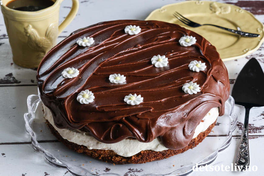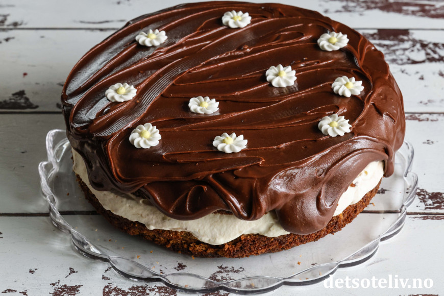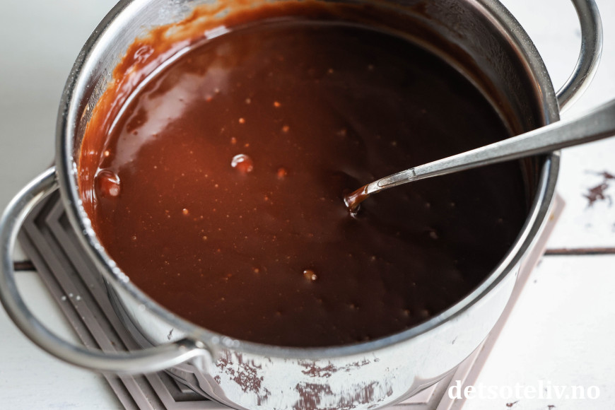♥ Sjokoladeglasuren vil være tynn når den er varm, men den tykner av å stå i kjøleskapet. Følg med på sjokoladeglasuren slik at den tas ut av kjøleskapet når den er passe fast i konsistensen. Hvis det skulle skje at den blir for fast, må glasuren stå i romtemperatur igjen for å mykne før du kan bre den over kaken.
