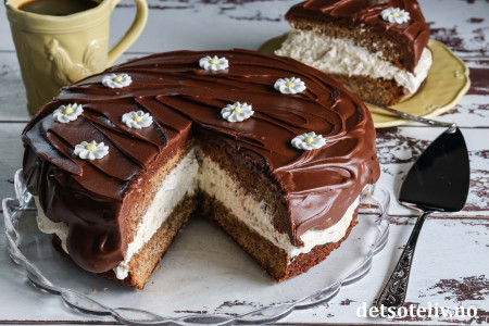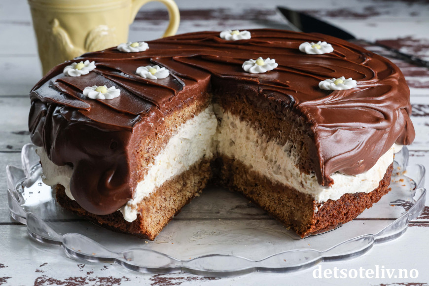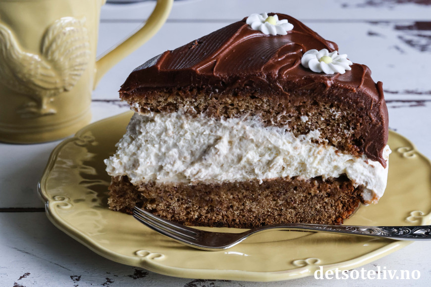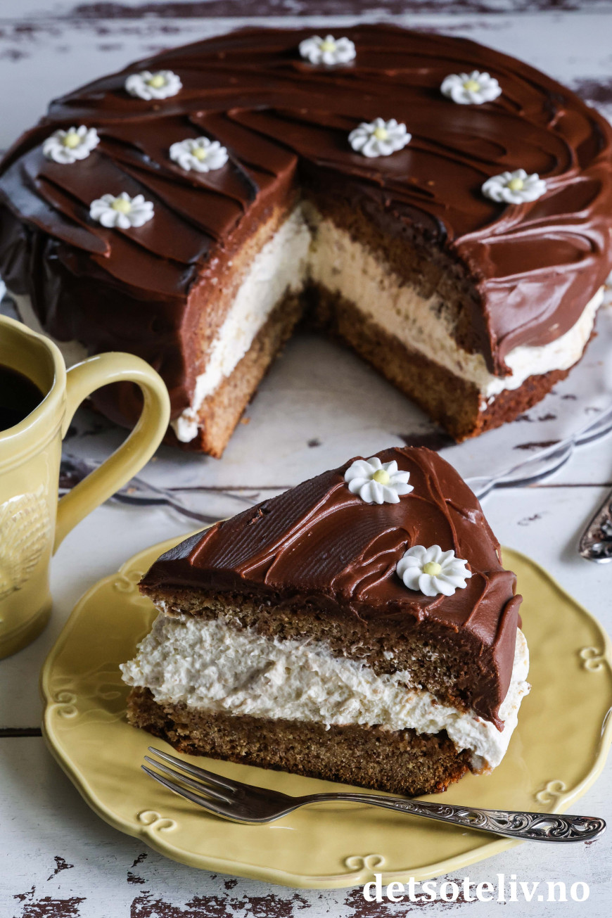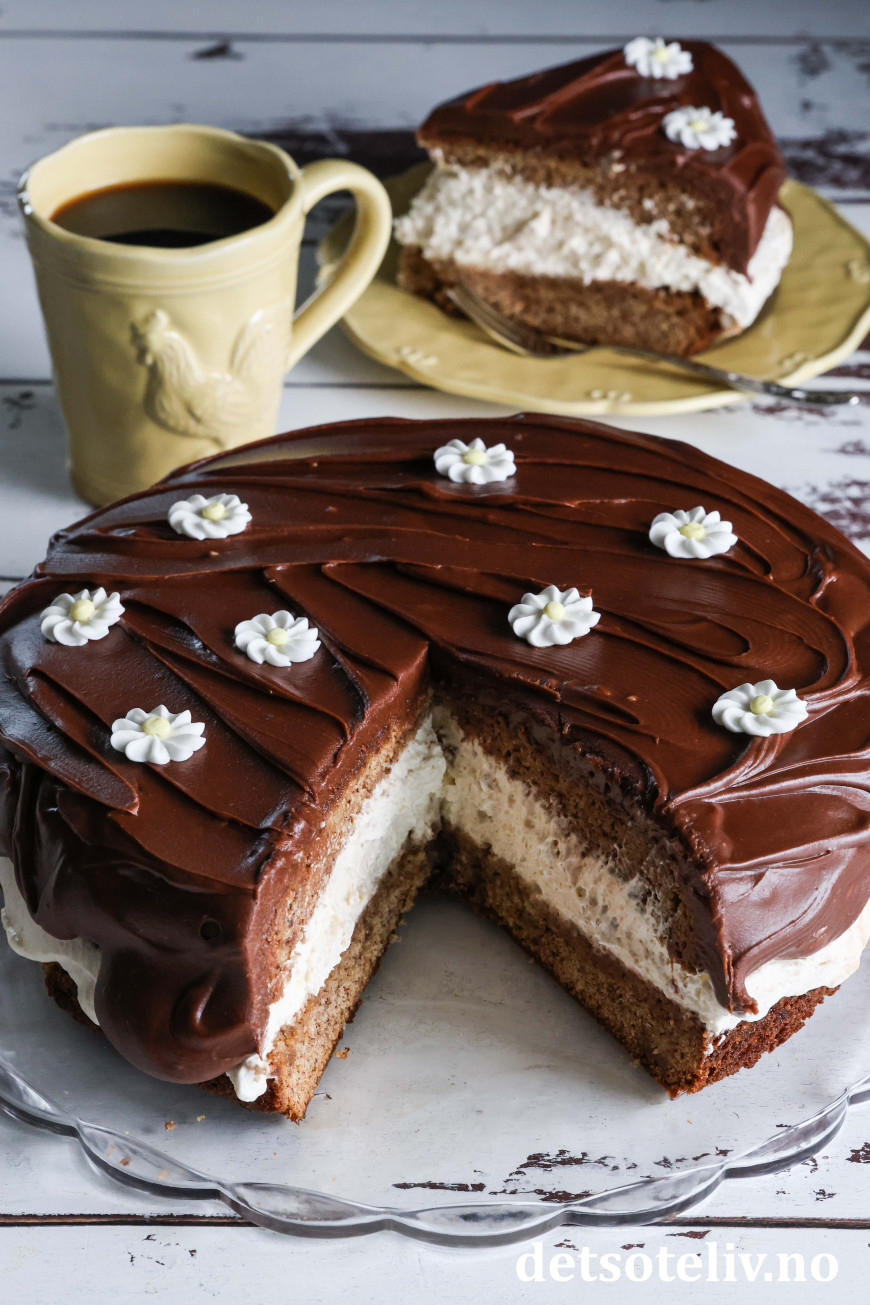 Luftig og søt banankrem og tykk sjokoladeglasur gjør denne banankaken ekstra god!