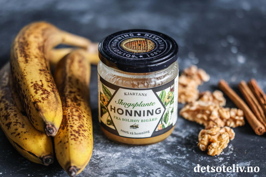 Det er ikke sukker i denne kaken, men sødmen kommer fra honning og godt modne bananer.