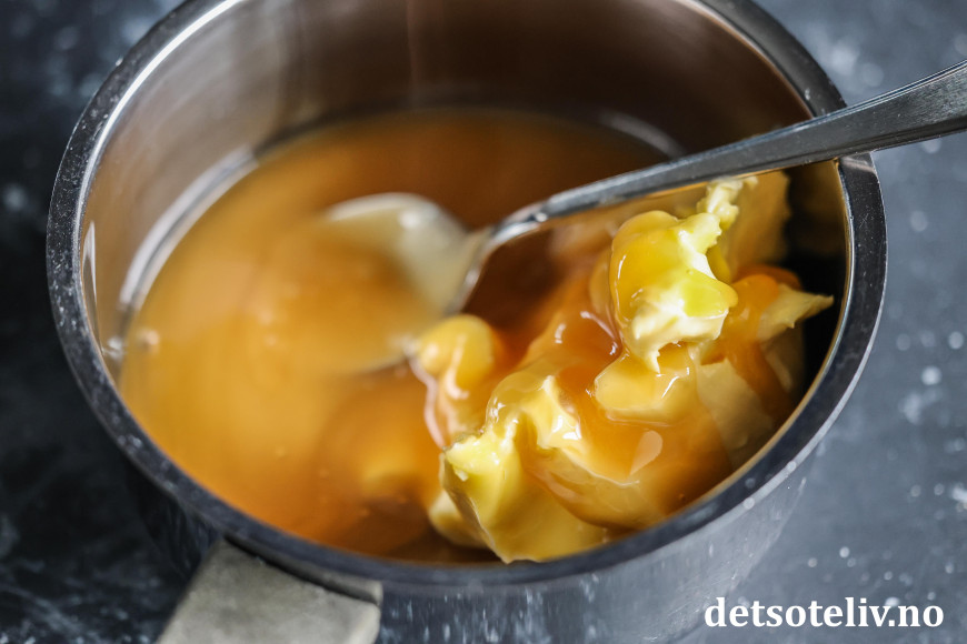 Ha honning og smør i en liten kjele. Varm opp på svak varme til smøret har smeltet.