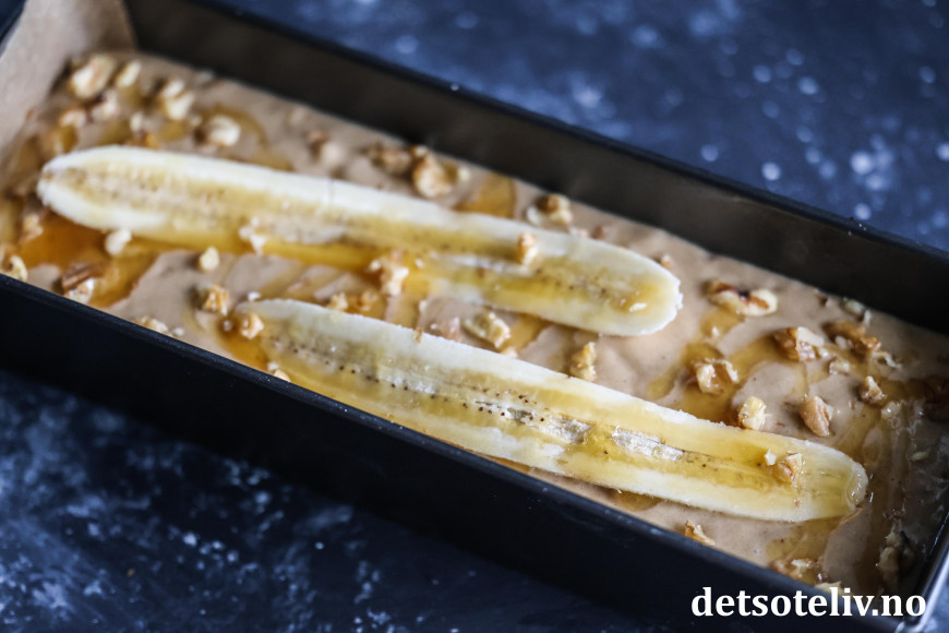 Del en banan på langs og legg oppå deigen som pynt. Dryss over noen grovt hakkede valnøtter. Ringle over et par skjeer honning (varm opp forsiktig så honningen blir flytende).