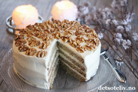 Fyll kaken med drøyt halvparten av ostekremen. Smør resten av kremen på toppen og langsmed sidene av kaken og pynt med valnøtter.