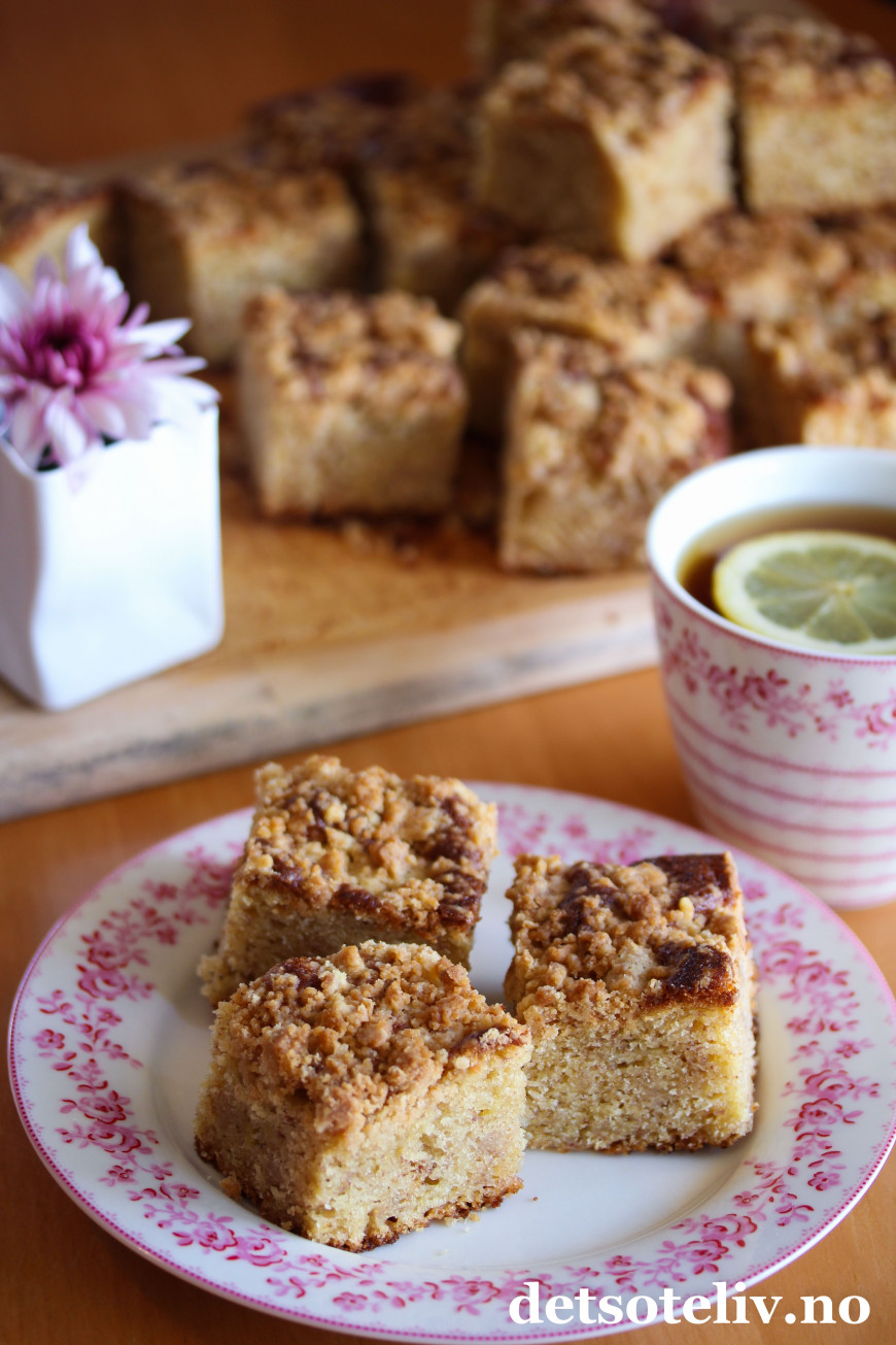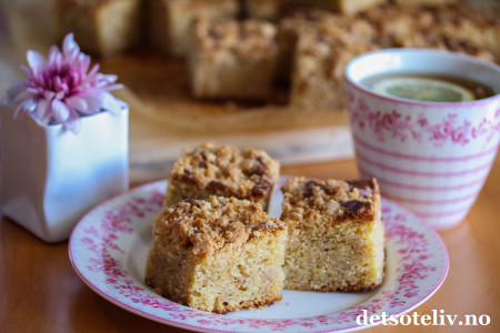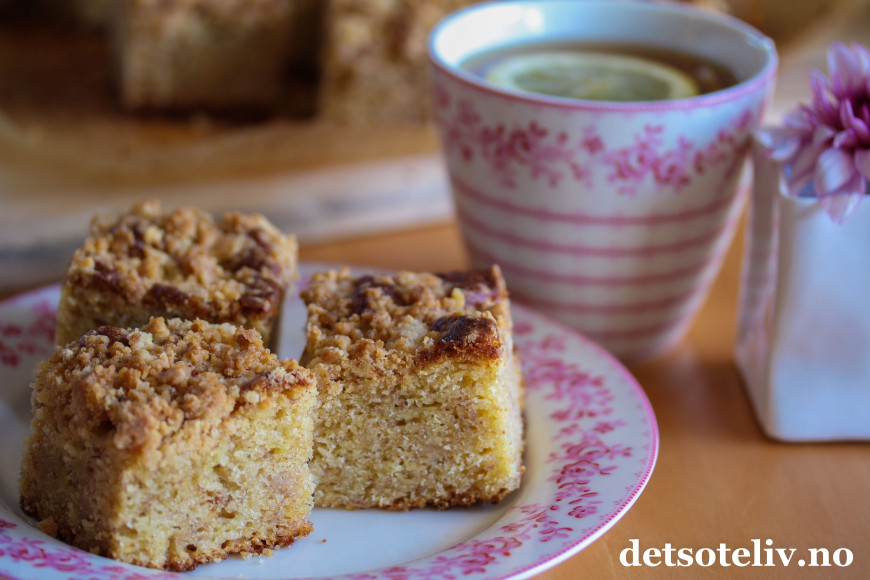 Jeg liker å drikke varm te med en sitronskive til denne kaken.
