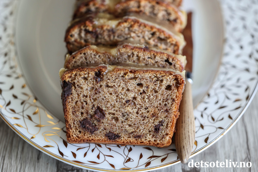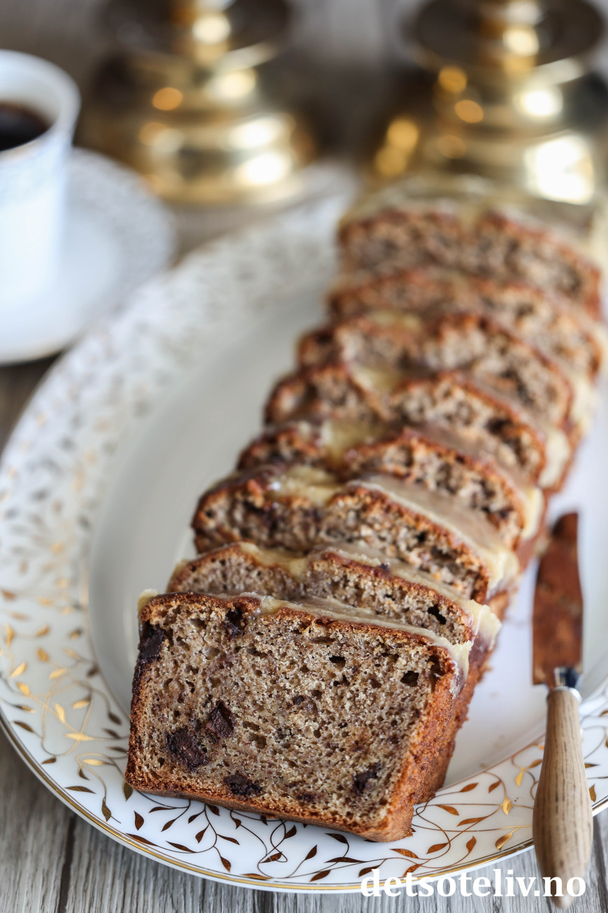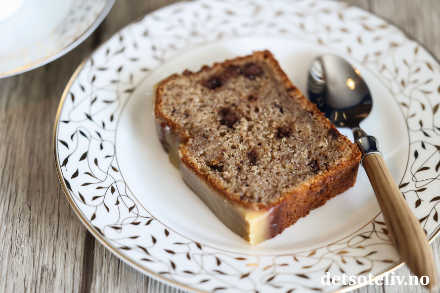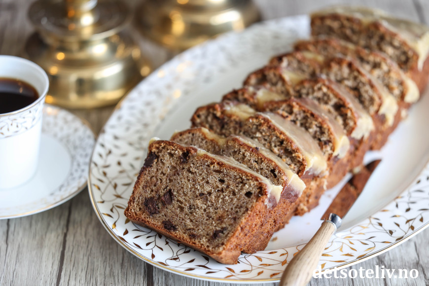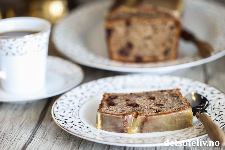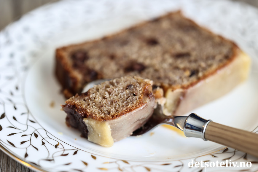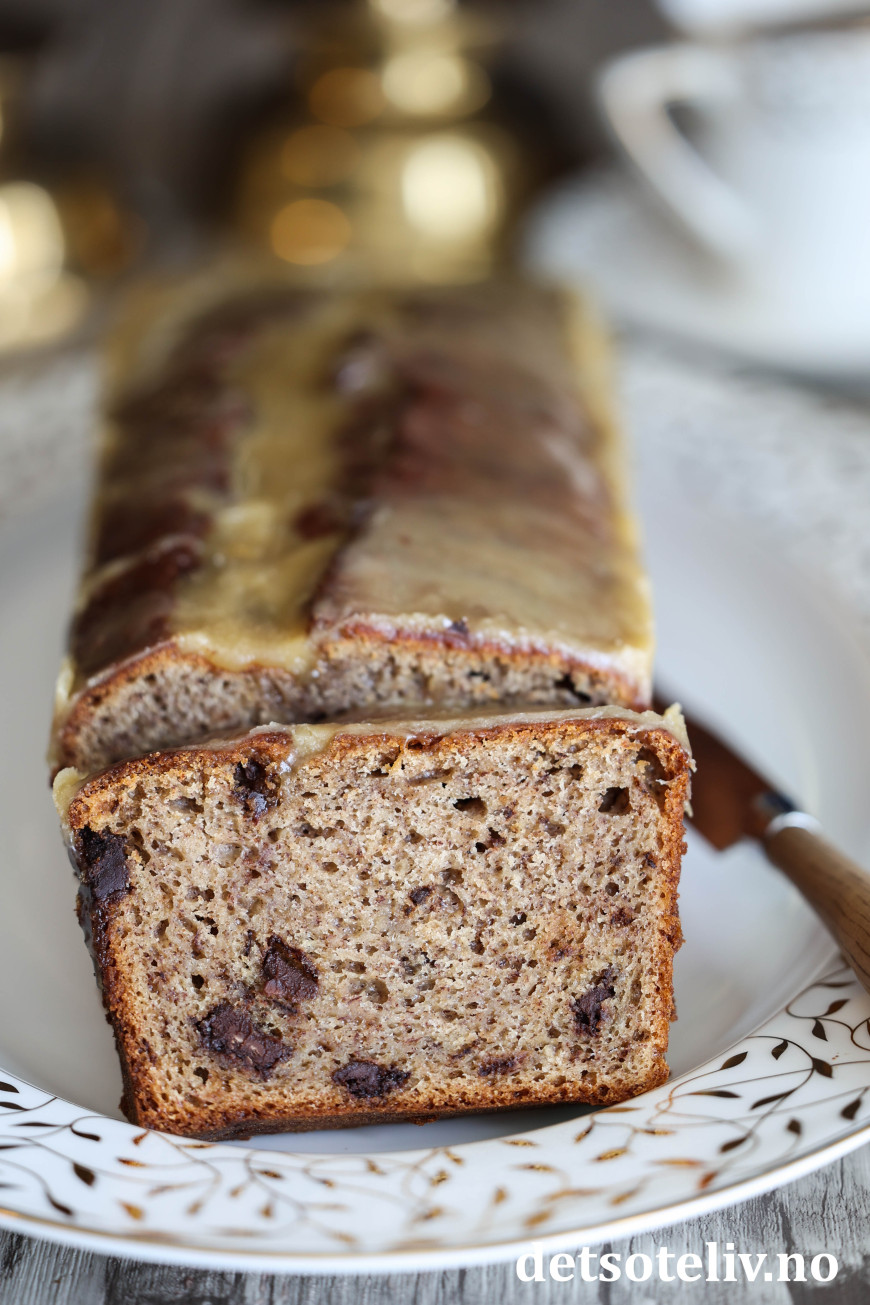 Denne deilige banankaken lages med krydder og sjokoladebiter. Når kaken er varm og nystekt, prikker man masse hull i kaken med en gaffel og heller over en nykokt karamellglasur. Glasuren synker inn i kaken og gjør kaken så spesiell og god!