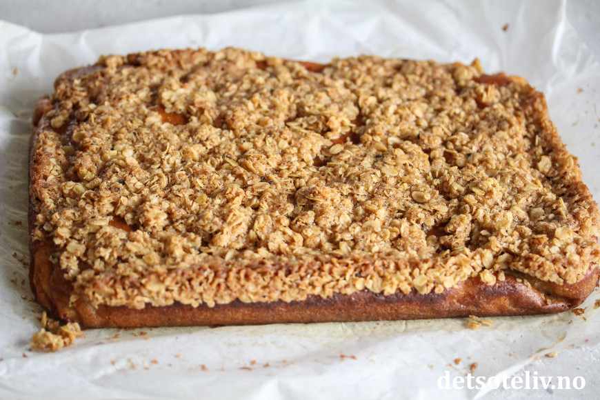 Åpne ovnsdøren etter at kaken har stekt i 10 minutter. Dra platen litt ut (men uten å ta kaken helt ut av ovnen) slik at du får smuldret havremassen jevnt over kaken.