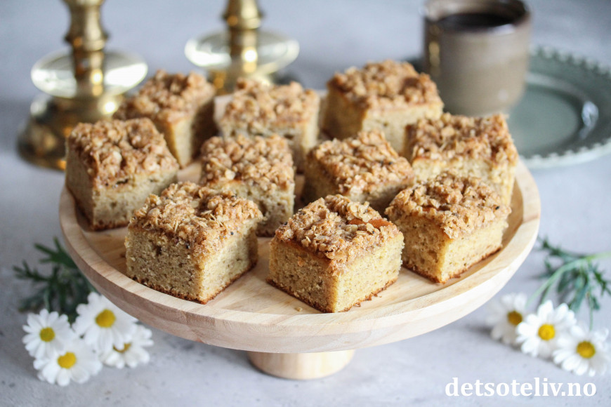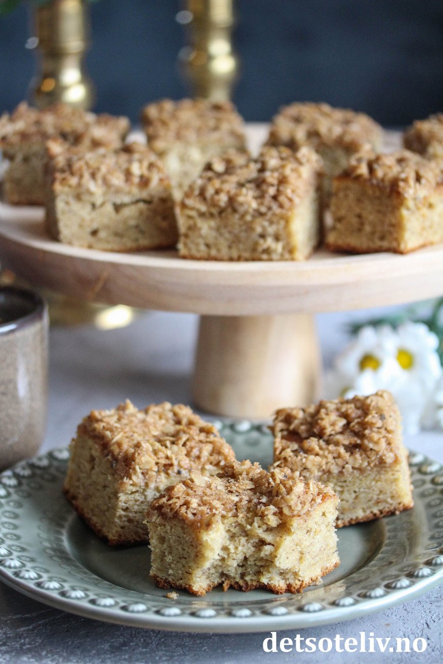 ♥ Jeg har her brukt malt kardemomme i kakedeigen og støtt kardemomme (dvs. kardemommekjerner støtt i morter) i havredeigen på toppen. Det går fint å bare bruke malt kardemomme eller bare støtt kardemomme begge steder.