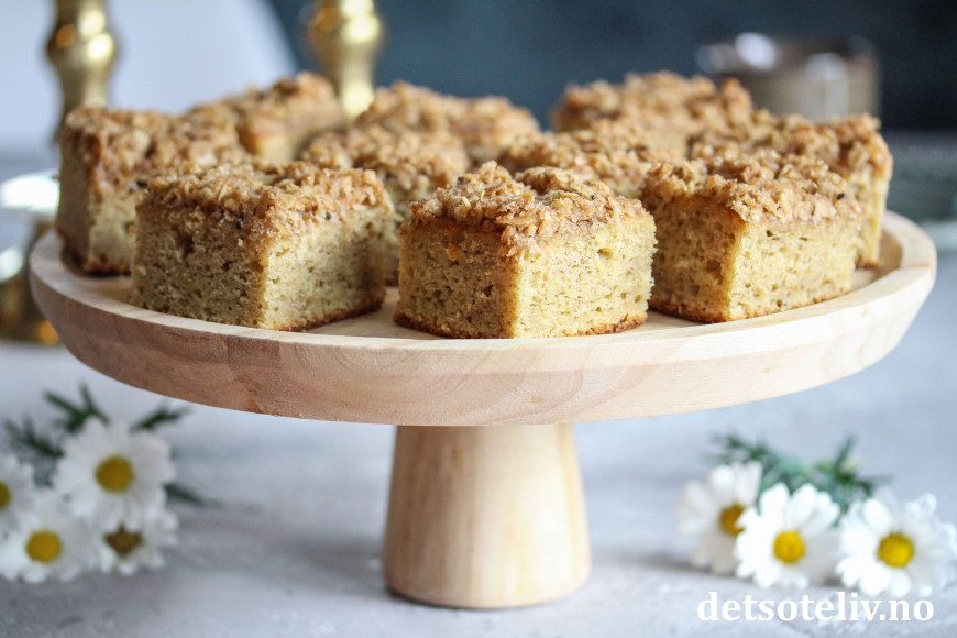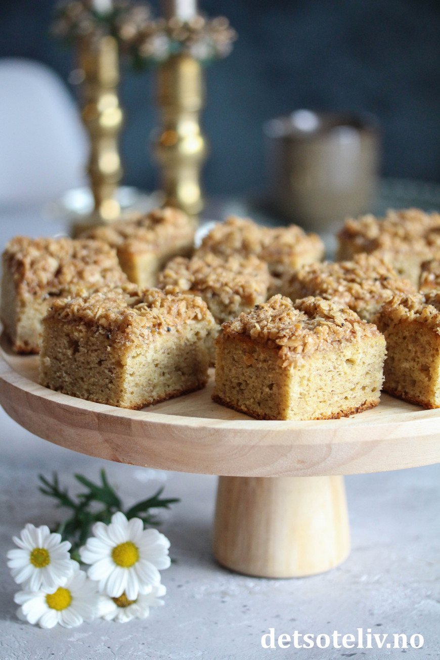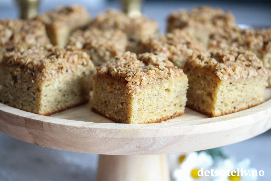 Dette er en myk og god banankake med lun smak av brunt sukker, kardemomme og havre.