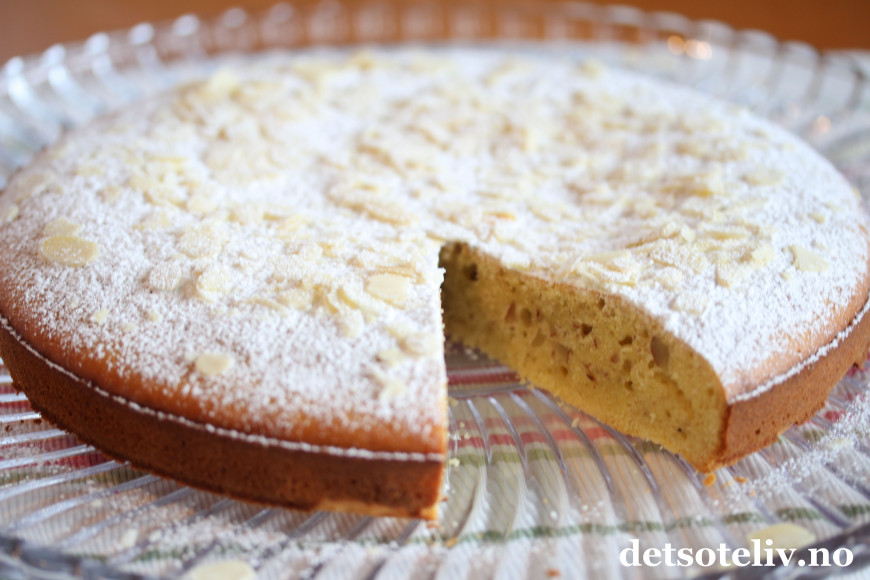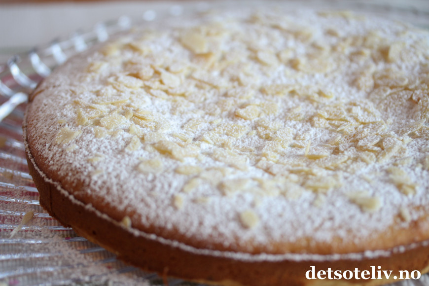 Ha deigen i en rund form (22 cm i diameter) med bakepapir i bunnen. Stek kaken midt i ovnen ved 180°C i 30-40 min (sjekk med kakenål at kaken er gjennomstekt). Avkjøl kaken i formen.