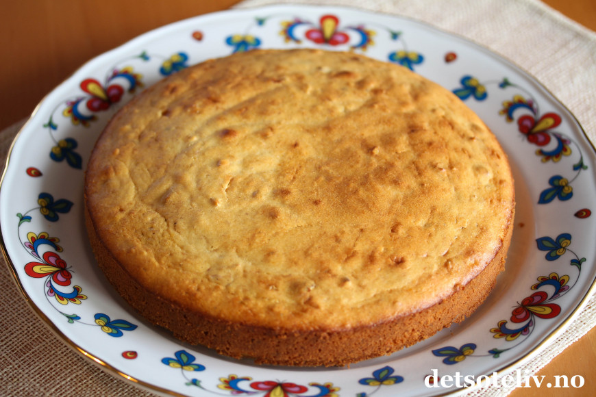 Ha deigen i en rund form (22 cm i diameter) med bakepapir i bunnen. Stek kaken midt i ovnen ved 180°C i 30-40 min (sjekk med kakenål at kaken er gjennomstekt). Avkjøl kaken i formen.
