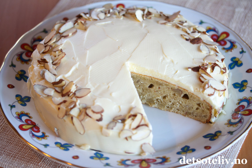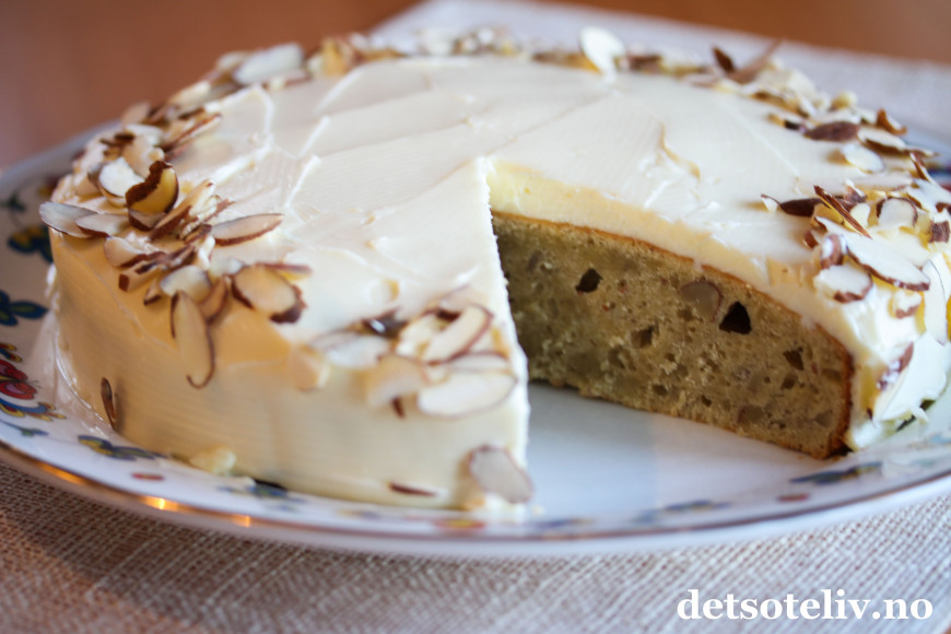 ♥ "Banankake med mandler og ostekrem" er holdbar om den oppbevares godt innpakket i plast. Den kan også fryses.
