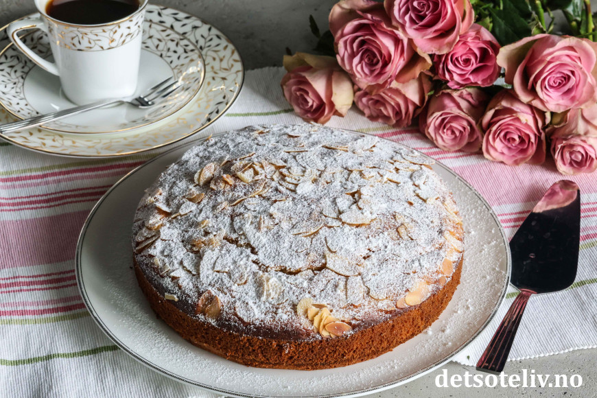 Pynt kaken med mandelflak og melisdryss.