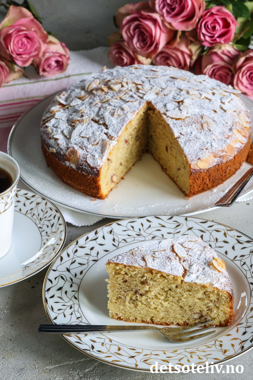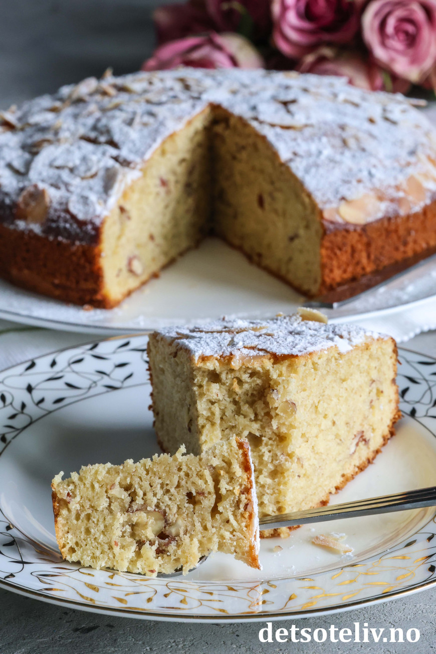 Ha deigen i en rund form (22 cm i diameter) med bakepapir i bunnen. Stek kaken midt i ovnen ved 180°C i 30–40 minutter (sjekk med kakenål at kaken er gjennomstekt). Avkjøl kaken i formen.