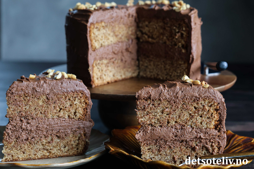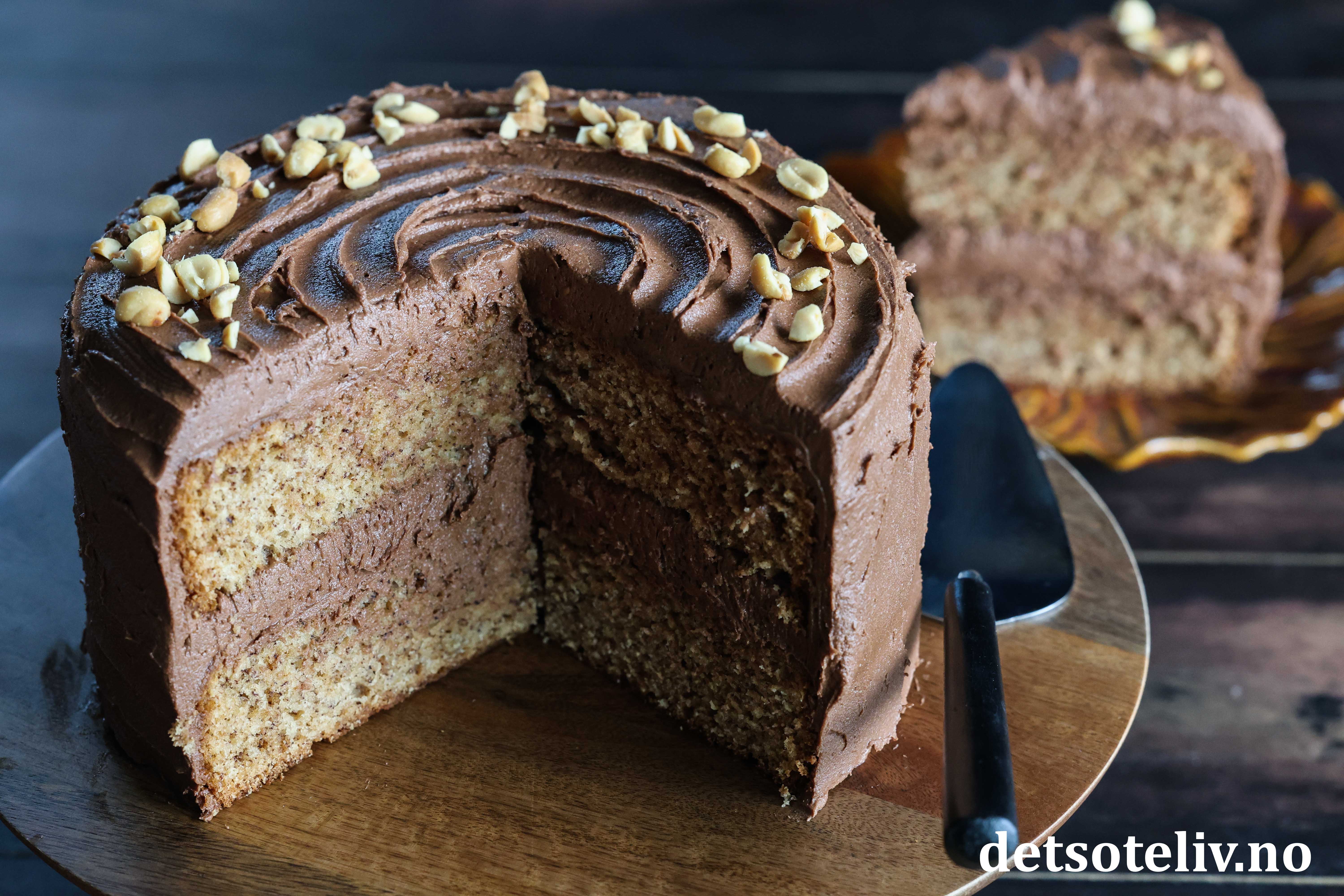 Dette er en myk og saftig banankake som fylles og dekkes med en skikkelig digg smørkrem, som inneholder både sjokolade og peanøttsmør.