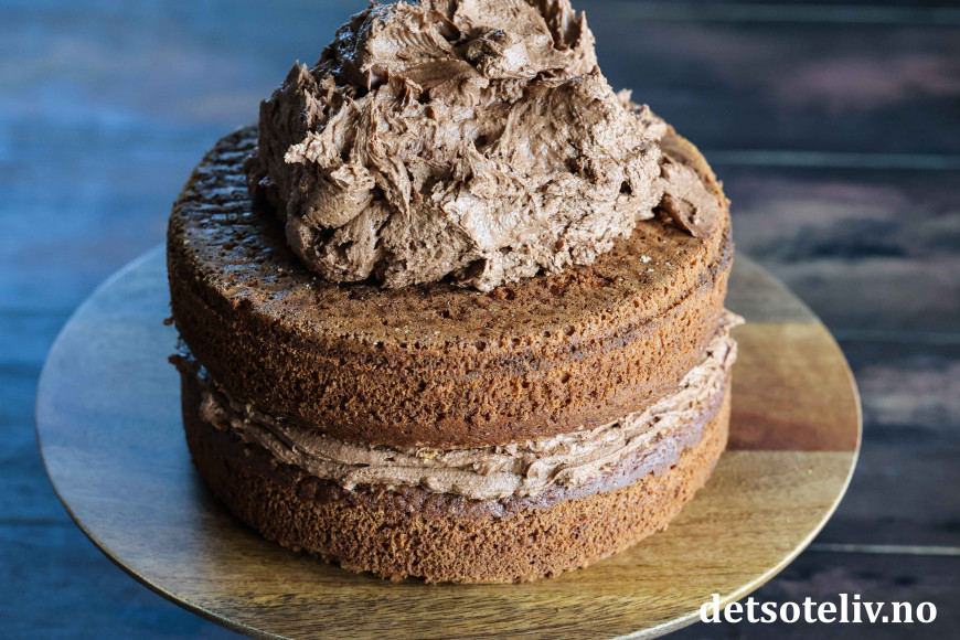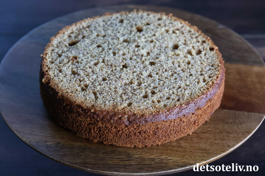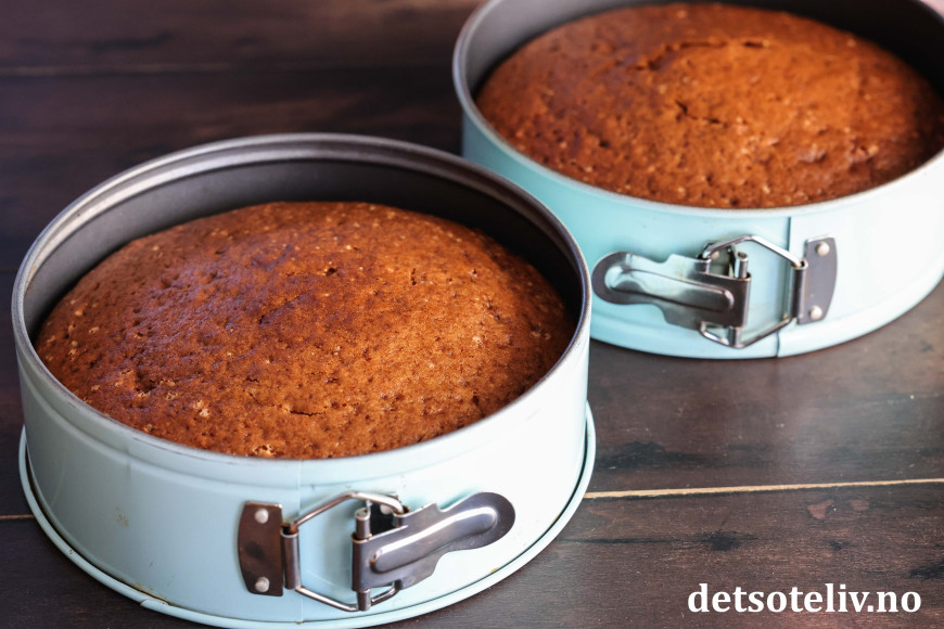 ♥ Hvis du ikke har 2 like store kakeformer, går det helt greit å steke en kakebunn av gangen. Halve kakedeigen kan stå i romtemperatur og vente mens den første kakebunnen steker.