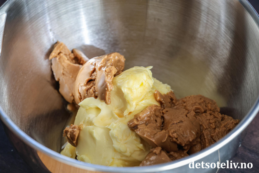 Pisk sammen ingrediensene til kremen. Det er viktig at både peanøttsmør og smør er mykt og romtemperert.