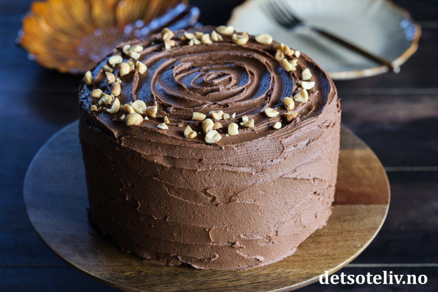 Fordel resten av kremen over hele kaken. Dryss på litt hakkede peanøtter til pynt.