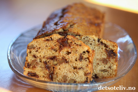 Min favorittbanankake i en kjempegod variant med hakket kokesjokolade og valnøtter!