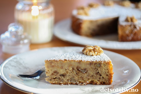 Banan og valnøtter er en utrolig god kombinasjon, og jeg har hatt suksess med denne enkle kaken ved mange anledninger. Blant annet er denne kaken en av mine svigerforeldres absolutte favorittkaker! Kaken er svært saftig og veldig holdbar.