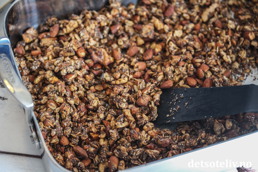 Stek granolaen midt i ovnen ved 180 °C i 25 minutter. Rør rundt etter 15 minutters steketid slik at granolaen blir jevnt stekt.