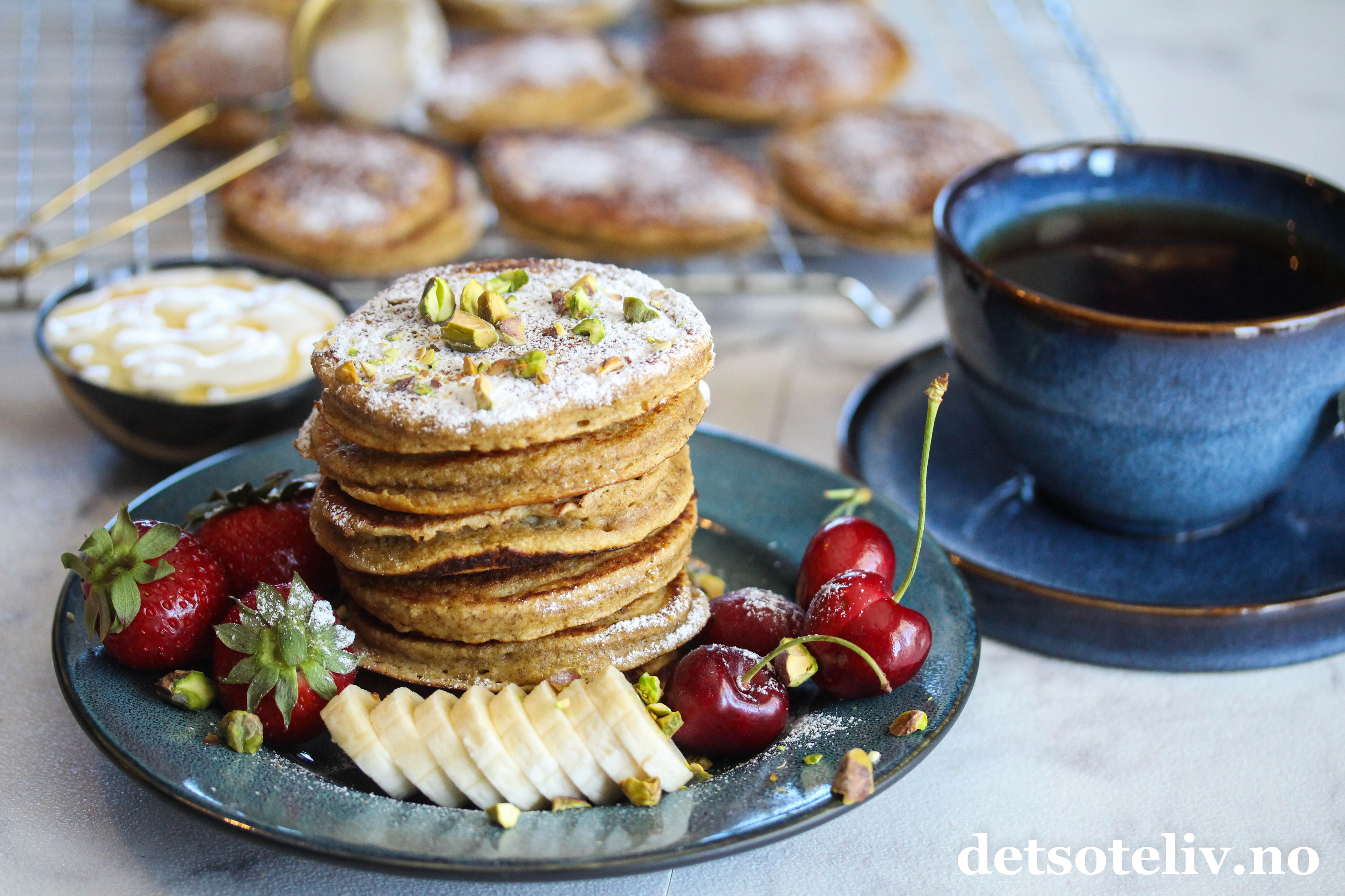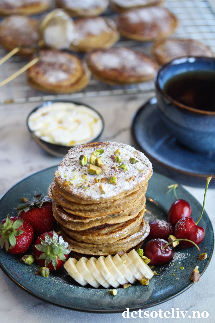 Server gjerne med et lite melisdryss, bær, bananskiver og honningyoghurt. Og kanskje et lite dryss pistasjnøtter.