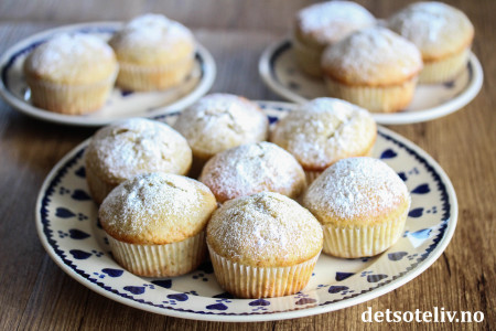 Sett doble papirformer utover på en stekeplate og fyll deigen i formene ved hjelp av to spiseskjeer. Stek muffinsene midt i ovnen ved 200°C i 10 min. Avkjøl og sikt over melis.