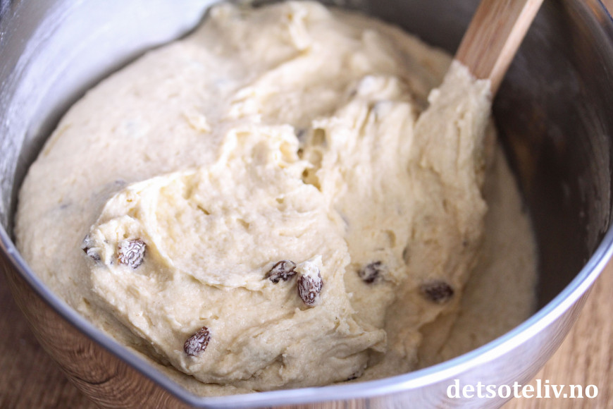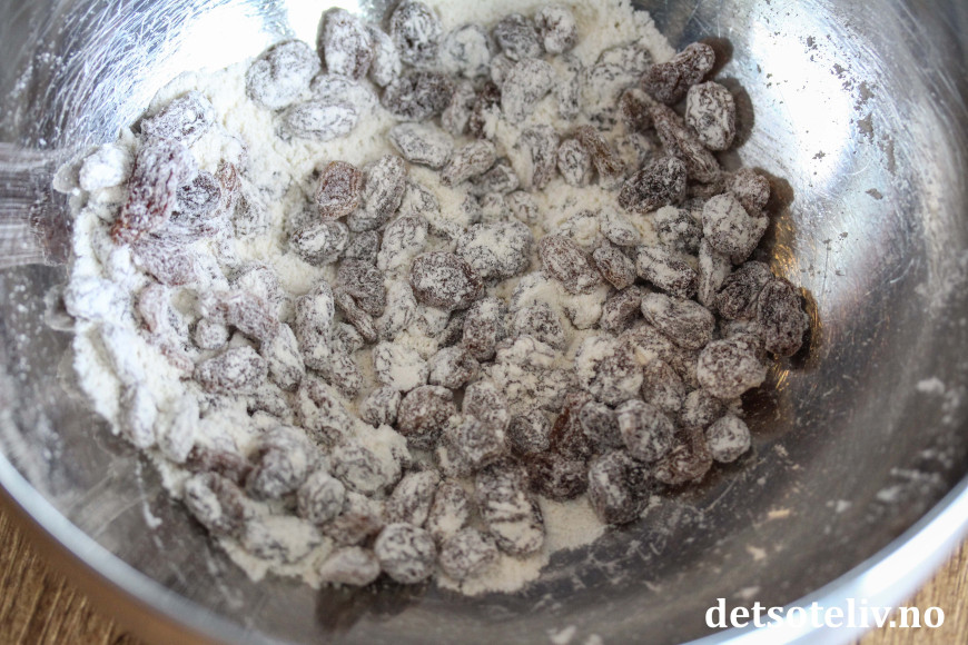 Vend rosiner i 1 ss av hvetemelet (dette forhindrer at rosinene synker til bunns under stekingen).