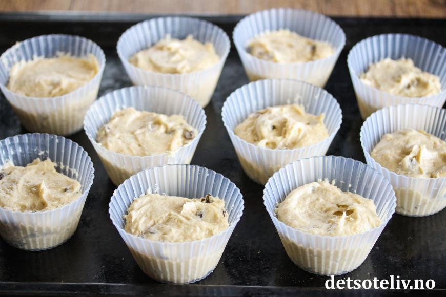 Fyll deigen i muffinsformer så de blir ca 3/4 fulle.