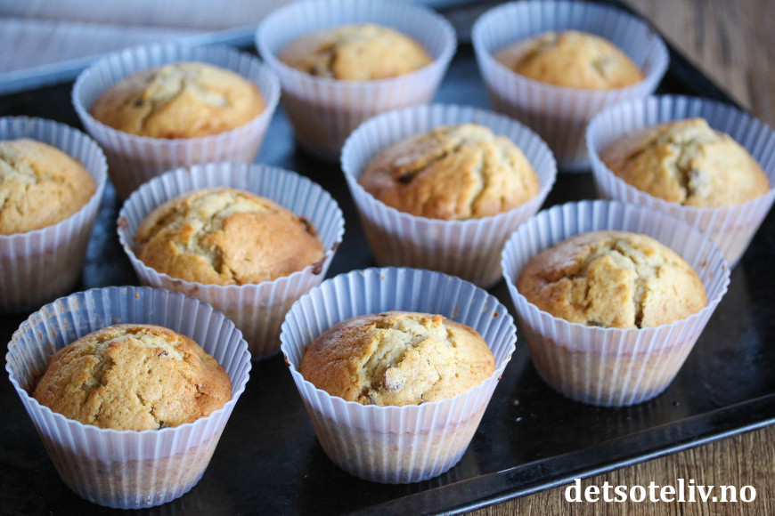 Fyll deigen i muffinsformer så de blir ca 3/4 fulle. Oppskriften gir som sagt ca 10 store muffins eller 20 muffins hvis du bruker former i ordinær størrelse.