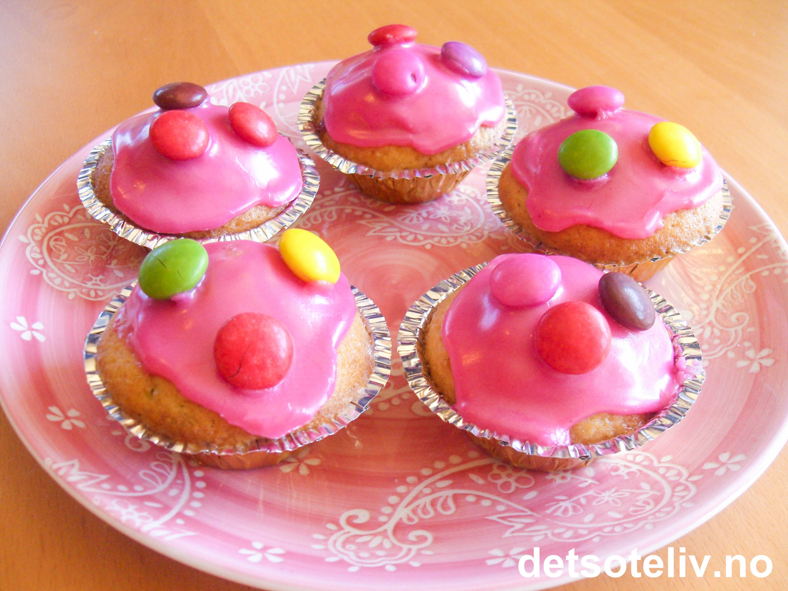 Pynt muffinsene med glasur og Smarties før servering.