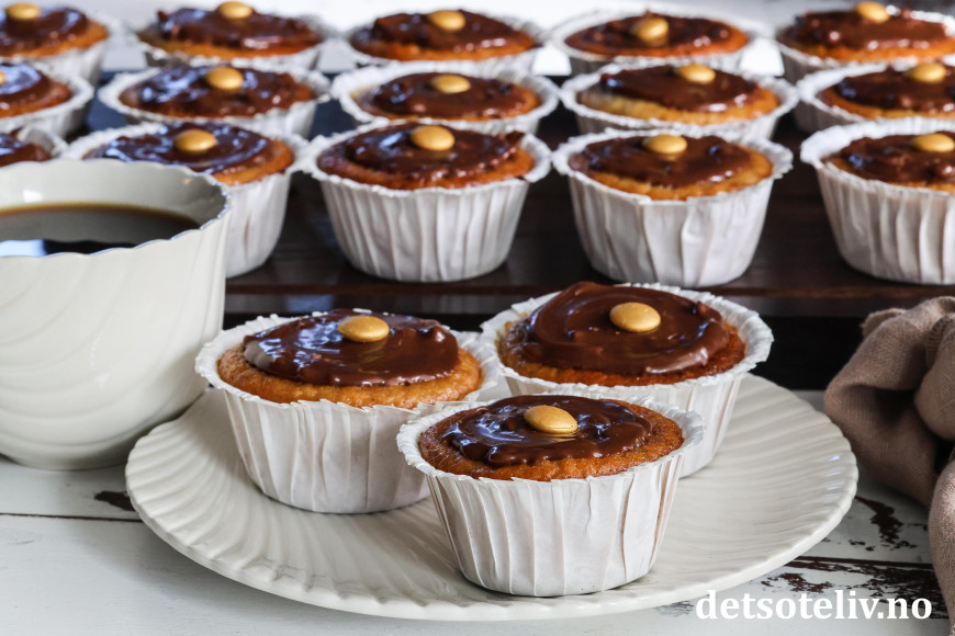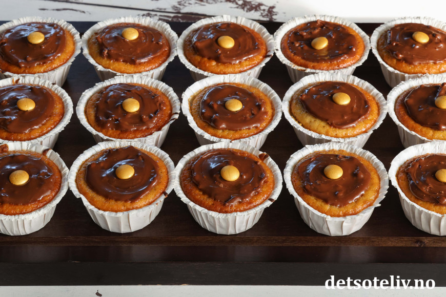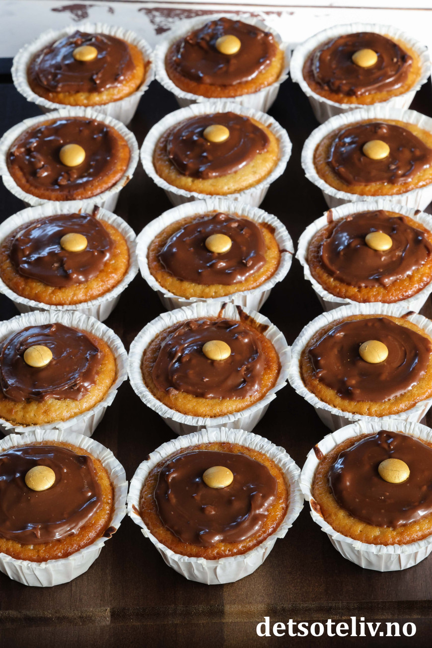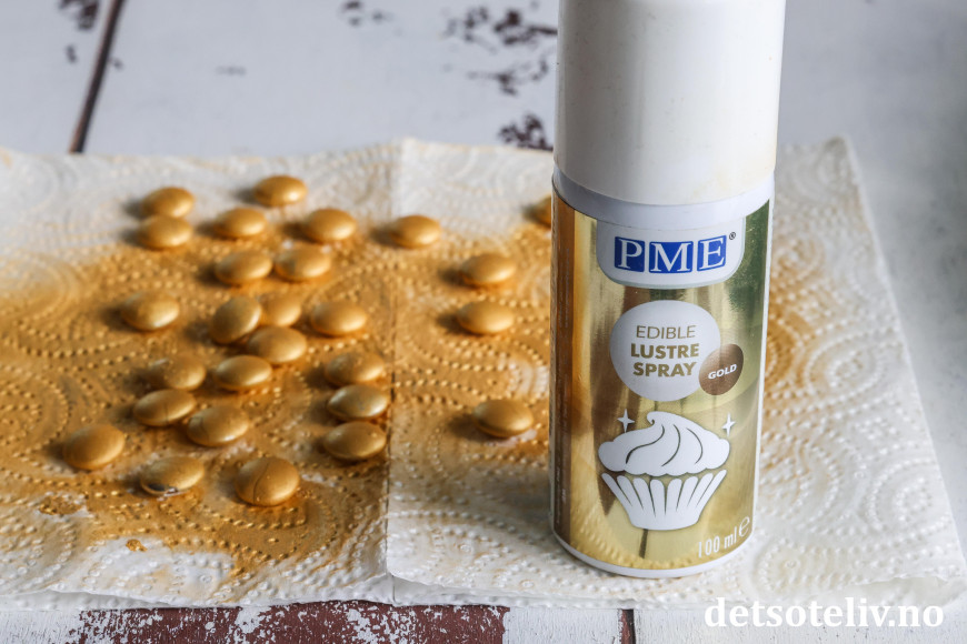 ♥ Smartiesene med gullfarge har jeg farget med gullspray. Du kan like godt pynte muffinsene med gule Smarties eller Non-stop i stedet.