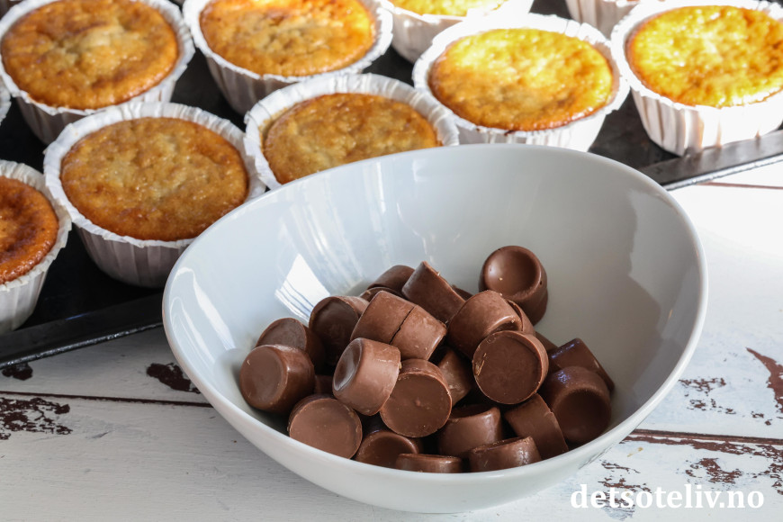 Stek muffinsene midt i ovnen ved 180°C i ca. 20 minutter (sjekk med kakenål).