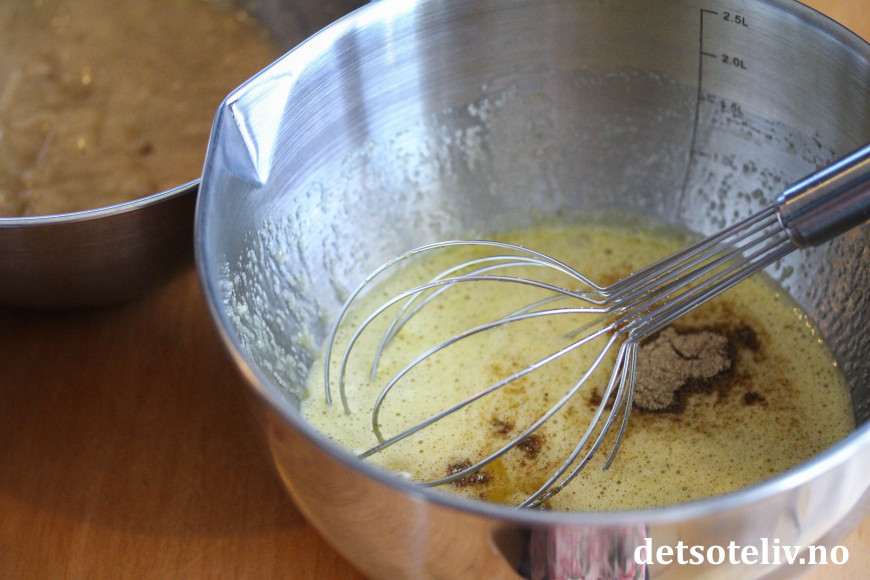 Pisk sammen egg, sukker, vaniljesukker og kardemomme med en stålvisp.