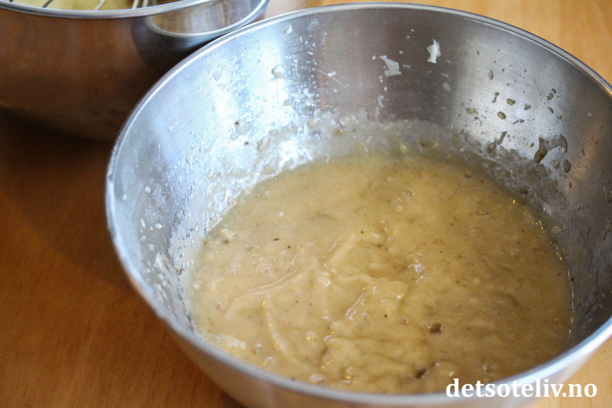 Mos bananene (gjøres raskt med stavmikser) og bland i.