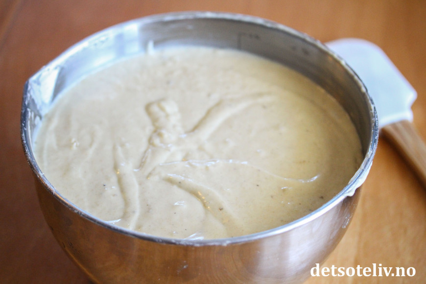 Rør til deigen er glatt og klumpfri. Den skal bli nokså tykk i konsistensen, men synes du den blir for tykk, kan den spes med litt mer melk eller vann.