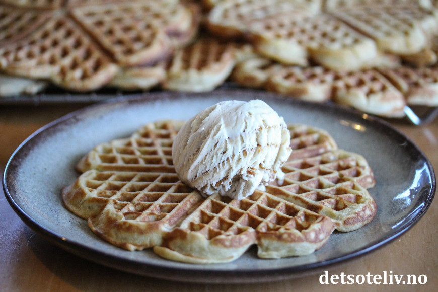 Stek gylne vafler i smurt vaffeljern på middels varme.