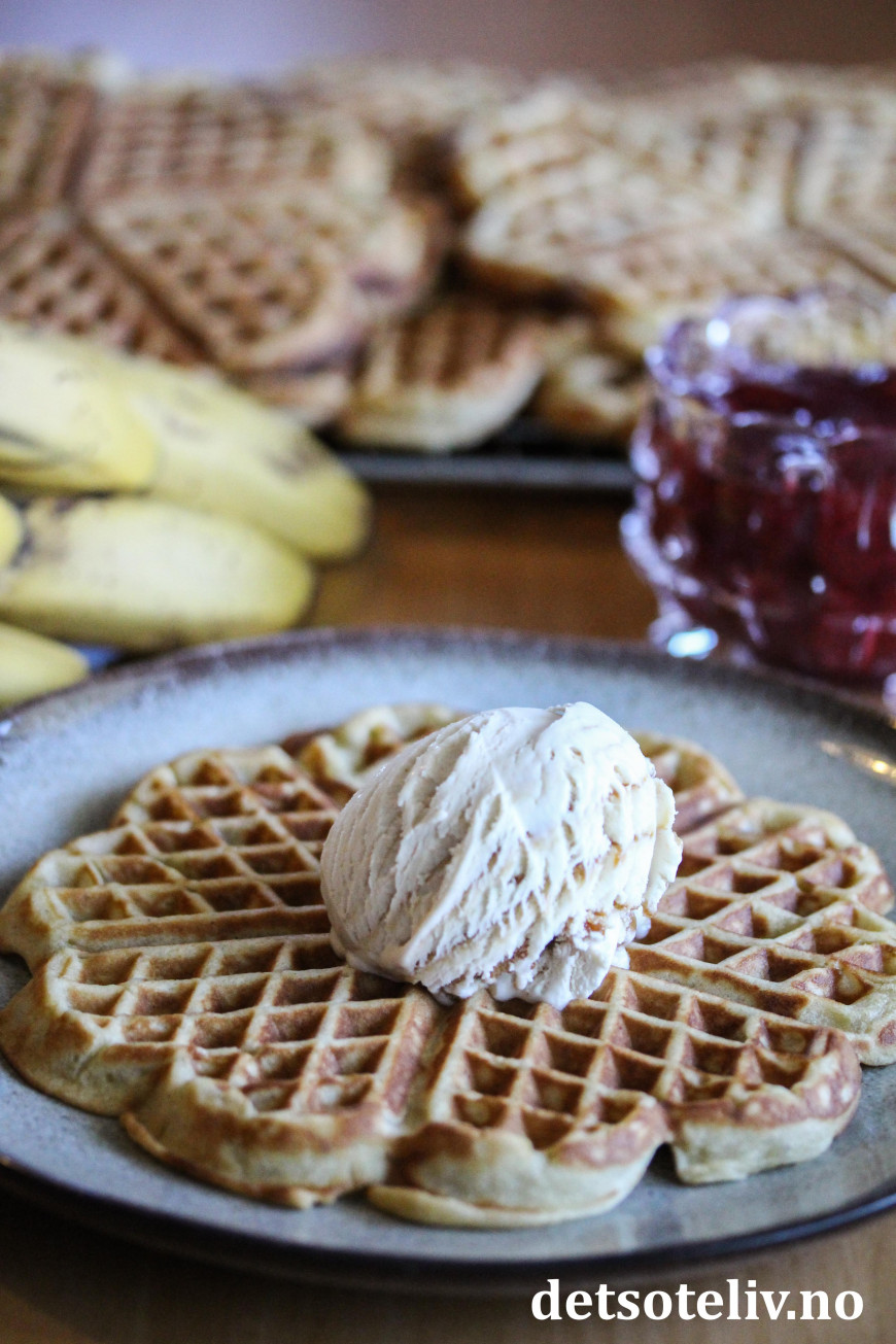 NammenammenammeNAM! Dette er utmerkede vafler å lage om du har noen bananer liggende som begynner å gå ut på dato. Stor stas for små og store (forvokste) barn!