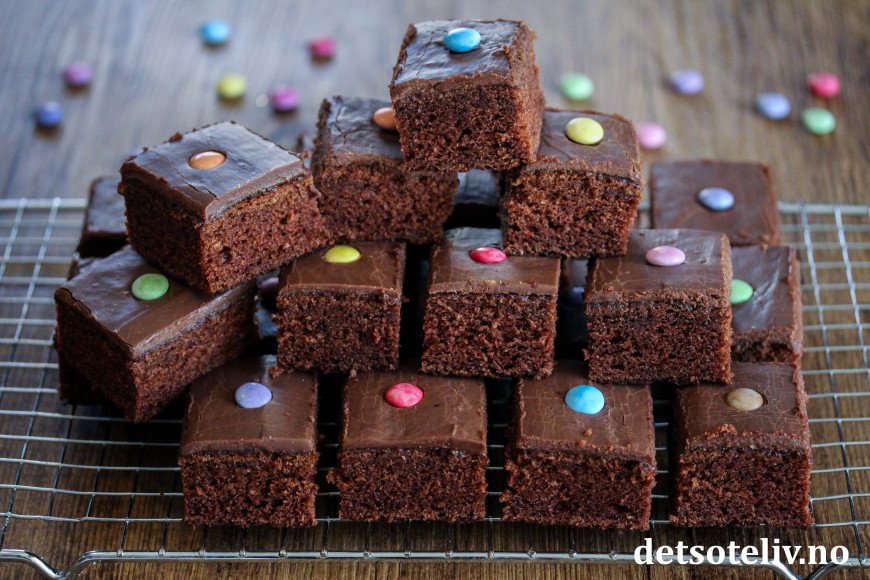 Non Stop kan byttes ut med Smarties. Se også oppskrift på "Melkesjokoladekake i langpanne".