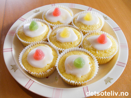 Pynt de kalde muffinsene med litt melisglasur og gelétopper.