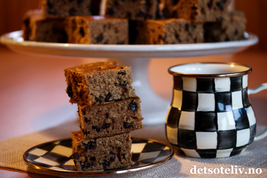 Ha deigen i en stor, bakepapirkledd langpanne (ca 30x40 cm). Stek kaken på nederste rille i ovnen ved 200°C i 30-35 min. Avkjøl kaken i langpannen. Hvelv kaken ut av formen og fjern bakepapiret. Del kaken opp i passe store firkanter.