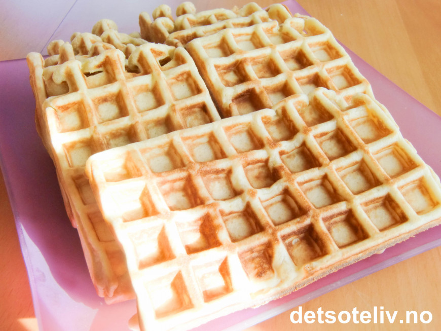 "Belgiske vafler" finnes i litt ulike typer. Disse her inneholder rømme og gir derfor tykke, myke vafler uten sukkerskorpe på toppen. Serveres gjerne med for eksempel rømme og syltetøy, eller med iskrem, bær og sjokoladesaus.