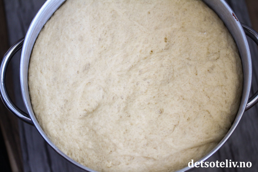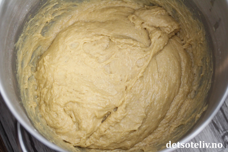 Tilsett sukker og kardemomme. Ha så i hvetemelet og elt deigen i ca. 10 minutter.