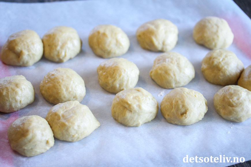 Rull deigen ut til runde boller (ca. 40 gram deig per bolle) og legg dem på bakepapirdekkede stekeplater. Bruk litt ekstra hvetemel dersom deigen er klissete.
