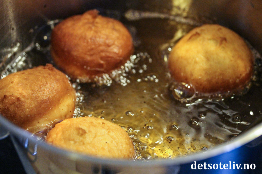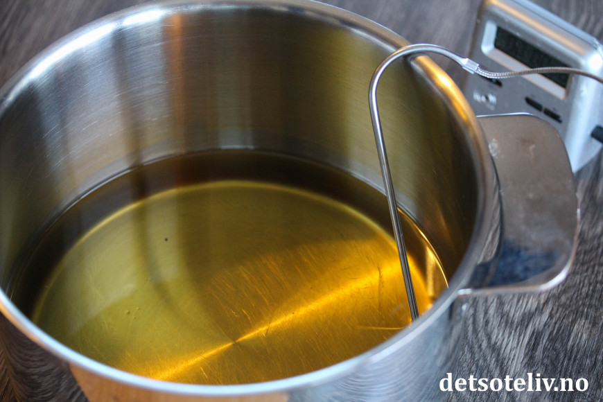 Varm opp oljen i en stor, vid kjele. Den skal holde 180–190 °C, så bruk helst et termometer eller bruk en frityrkoker så du har kontroll på varmen. Ha lokk tilgjengelig i nærheten som sikkerhet og husk at dersom oljen tar fyr, må du ALDRI ha i vann, men bare legge på lokket og slå av varmen.