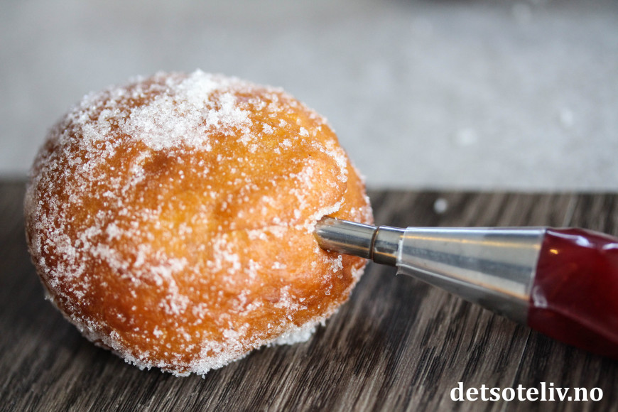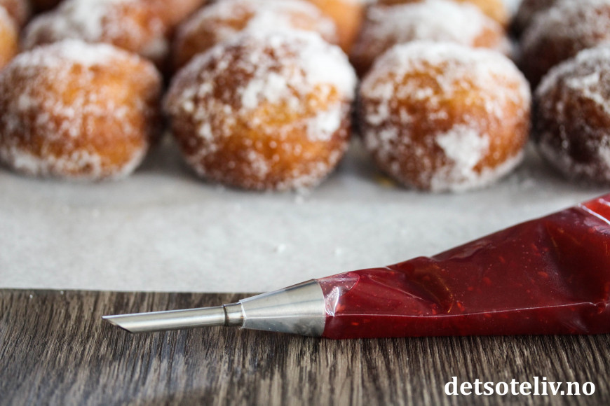 Før servering fylles berlinerbollene med tykt bringebærsyltetøy. Ha syltetøyet i en sprøytepose med spiss sprøytetipp som stikkes inn i bollene fra siden. Sprøyt en god mengde syltetøy inn i hver av bollene.